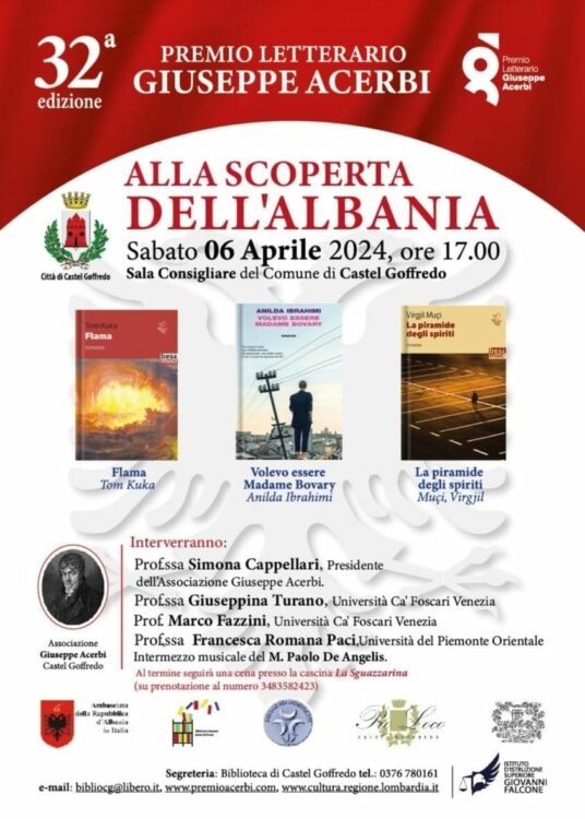 La XXXII edizione del Premio Letterario Giuseppe Acerbi ospita l’Albania e a rappresentarla sono i libri di una scrittrice italofona e di due autori tradotti: Volevo essere Madame Bovary di Anilda Ibrahimi, edito da Einaudi nel 2022, Flama di Tom Kuka (Enkel Demi), il volume vincitore del Premio dell’Unione Europea per la Letteratura 2021, nella traduzione di Valentina Notaro e La piramide degli spiriti di Virgjil Muçi, tradotto da Adriana Prizreni, che nel 2018 si è aggiudicato, in Albania, il Premio Kadare. I due ultimi romanzi sono entrambi pubblicati da Besa Muci Editore. A giugno, la giuria designerà il vincitore.